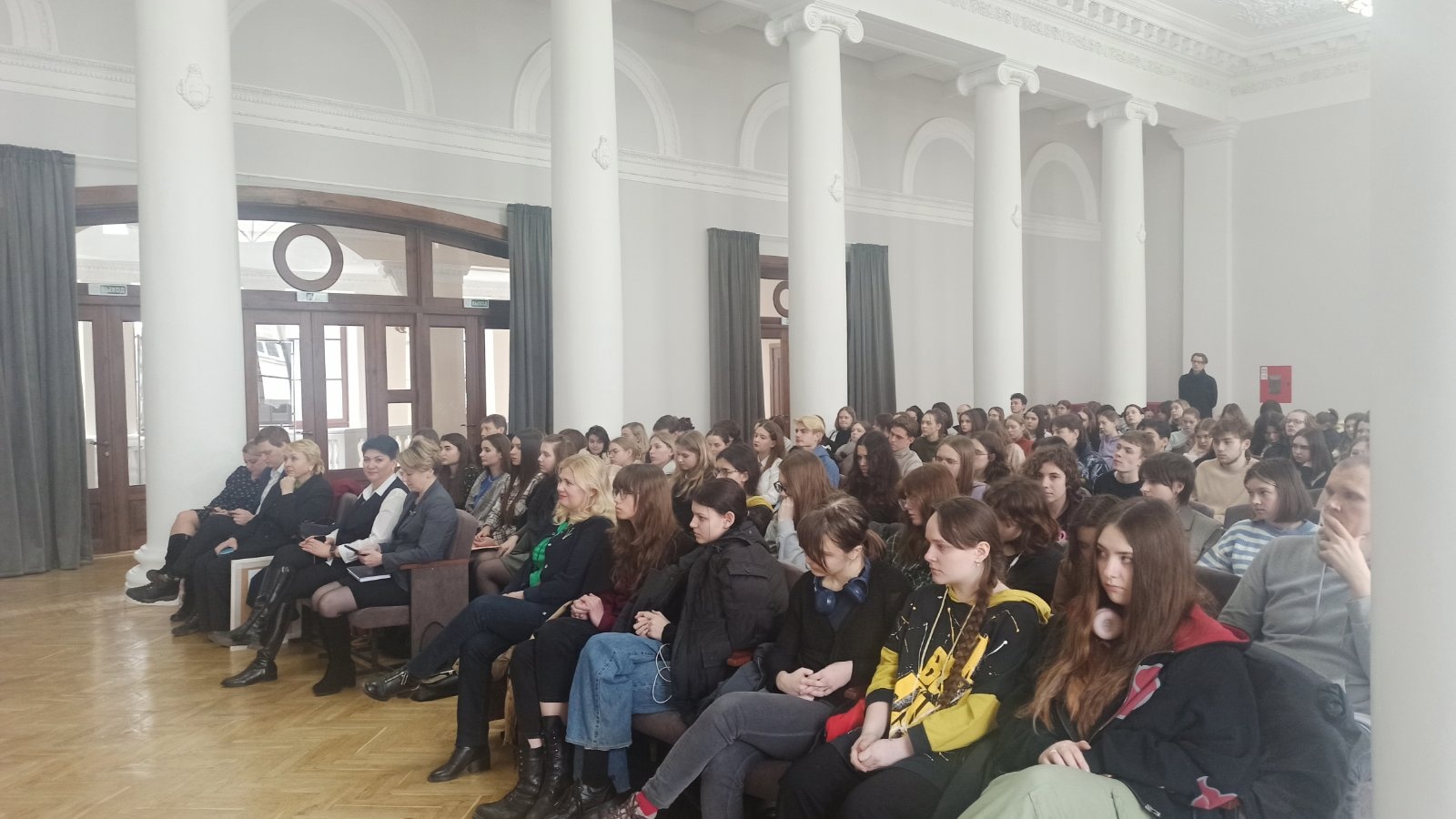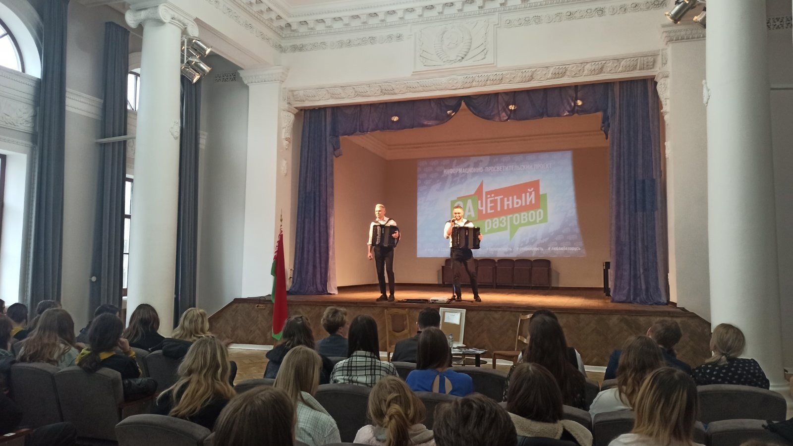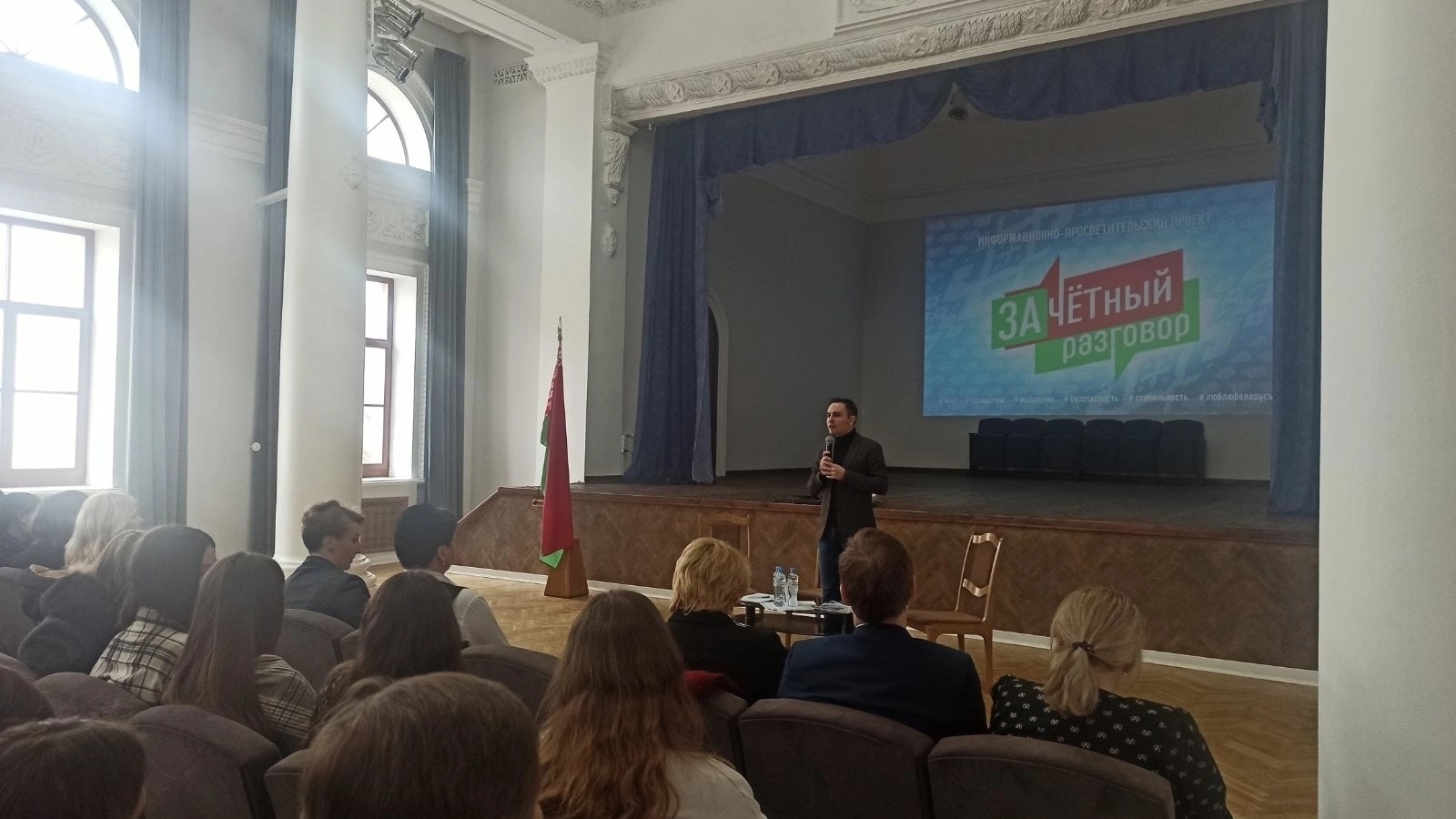 Главная / Мероприятия / Учащиеся #ГГХК приняли участие в работе просветительского проекта для студенческой и учащейся молодежи “ЗАчётный разговор”. В формате открытого диалога с учащимися и студентами встречаются политологи, депутаты и общественные деятели. С ребятами вел диалог заместитель генерального директора ОАО “Камволь” Макаревич Егор Андреевич