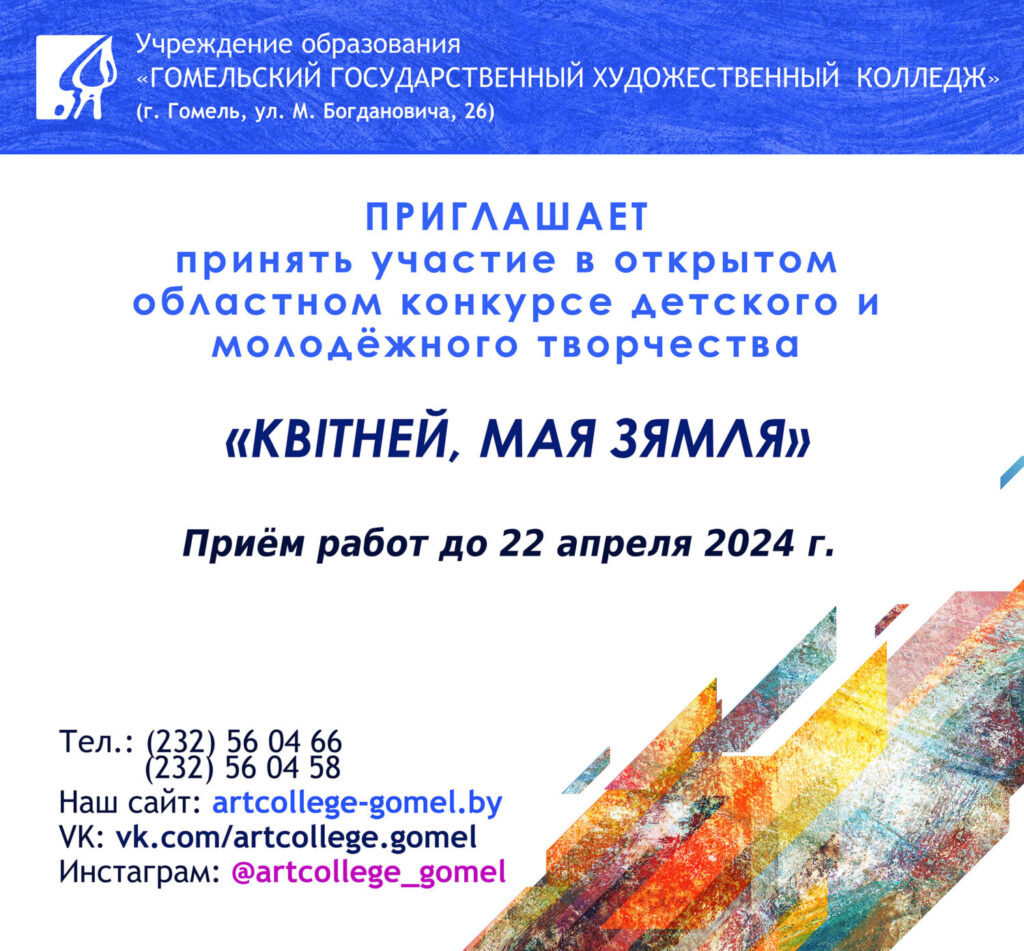 Приглашаем принять участие в открытом областном конкурсе детского и молодёжного творчества "Квітней, мая Зямля"! Работы принимаются до 22 апреля 2024 г. - Гомельский государственный художественный колледж