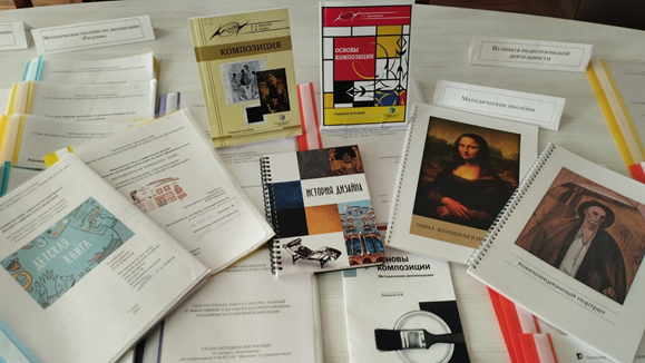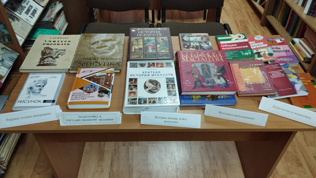 На выставке были представлены учебные пособия по предметам профессионального цикла («История всемирного и белорусского искусства», «Психология и педагогика», «Методика преподавания профильных учебных предметов», «Рисунок»), которые помогли в подготовке к государственному экзамену учащимся групп 4-го курса.